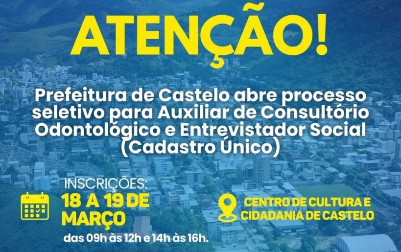 A Prefeitura de Castelo tornou público nesta terça-feira, 17 de março, o edital de Processo Seletivo Simplificado destinado à contratação temporária de profissionais para atender necessidades de excepcional interesse público da administração municipal. As oportunidades são voltadas a candidatos com escolaridade que variam do Ensino Fundamental incompleto ao Ensino Médio completo.